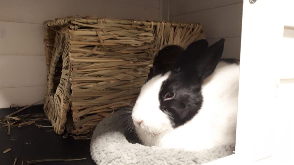 Intussen is zijn verblijf al aangevuld met een knaagtunnel met hooi en houtstronkjes gevuld met hooi. Hij kreeg al een kerstkadootje: een speeltunnel en een graafbak die we afgewisseld zullen aanbieden bij het vrij rondlopen. In zijn permanente ren zouden we hem te veel beweegruimte ontnemen moesten we die er nog bij in plaatsen.