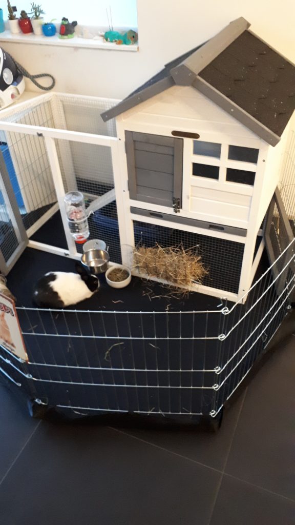 Gisteren, dinsdag 22 december, kwam Max zijn nieuw verblijf toe bij ons thuis. Met hulp van de kindjes hebben we zijn villa ineen gestoken zodat ie snel een ruimer konijnenproof verblijfje kon hebben. Het is een houten konijnenhok met ren geworden. Die is permanent uitgebreid met een halve ronde aan renpaneeltjes. Hier kan Max onbeperkt bewegen als we niet thuis zijn.